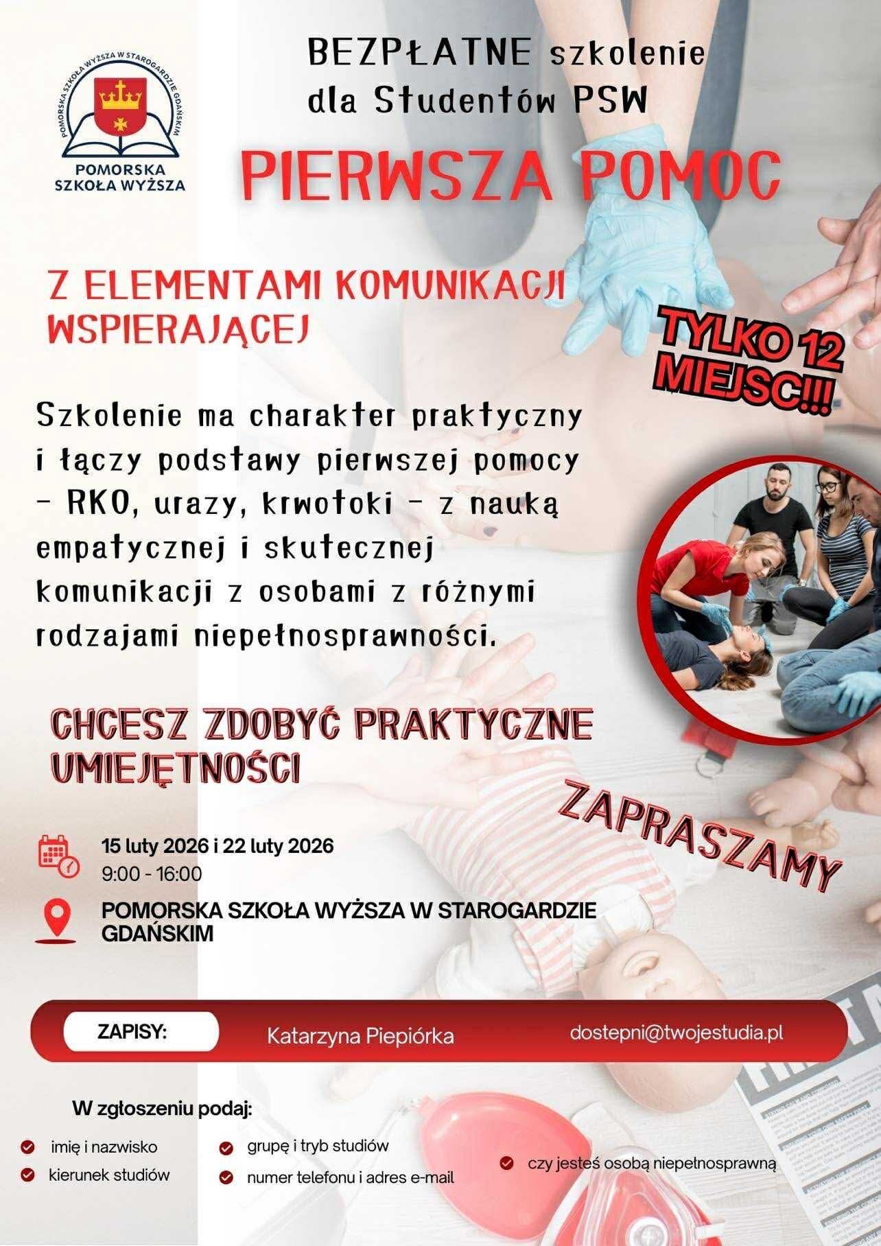 Zapraszamy studentów PSW na bezpłatne, 2-dniowe szkolenie z pierwszej pomocy z elementami komunikacji wspierającej. Zapisy trwają do 5 lutego 2026 roku, ilość miejsc jest ograniczona!